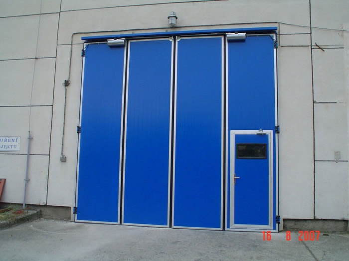 Aufgrund Ihrer (Sandwich-)Bauweise stellen Sie eine gute Lösung zum Verschluß von großen Gebäudeöffnungen dar, welche über wenig Platz im Sturzbereich verfügen, oder z.B. eine schnelle Öffnung (Schnelllauf-Falttor) benötigen. Das Öffnen erfolgt einseitig oder getrennt auf beide Seiten der Öffnungen von einem Flügel. Schlupf- und Nebentüren sind möglich.
